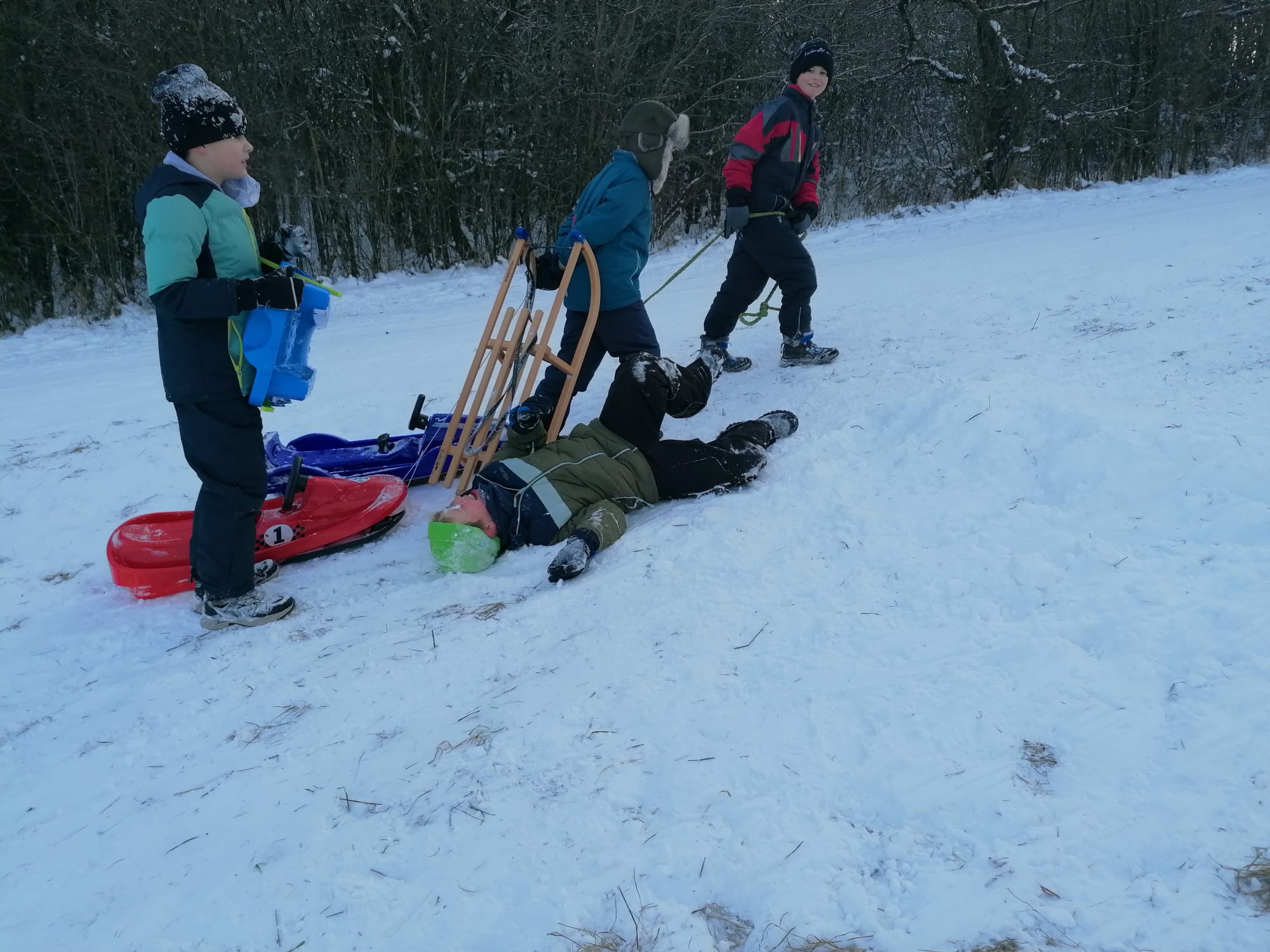Zum Ende der Weihnachtsferien bescherte uns das Wetter viel Schnee, den die Kinder begeistert feierten. Und so nutzten wir an zwei Tagen die Gelegenheit „Am Galgen“ Schlittenfahren zu gehen.